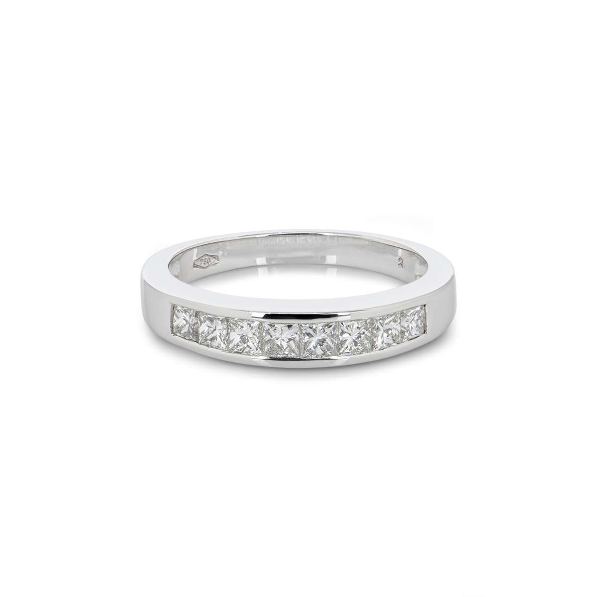 A timeless 18k white gold diamond half eternity ring. The channel set band features 8 princess cut diamonds with an approximate total weight of 0.74ct, G colour and VS clarity. The ring is currently a size O but can be adjusted for the perfect fit.