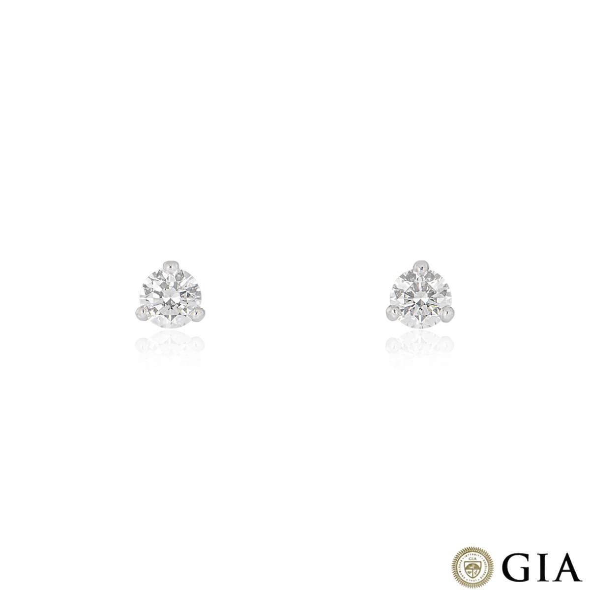 A pair of 18k white gold diamond stud earrings. The earrings feature round brilliant cut diamonds in a 3 claw setting. The first diamond weighs 0.53ct is G colour and VS2 clarity. The second diamond weighs 0.54ct is G colour and VS1 clarity. The earrings have post and butterfly fittings, with a gross weight of 1.7 grams.
