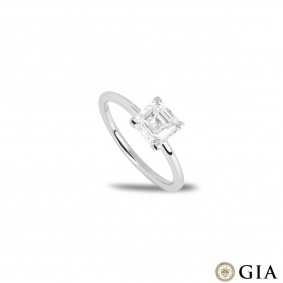 A timeless 18k white gold diamond engagement ring. The six prong solitaire is set with a round brilliant cut diamond weighing 1.34ct, I colour and VS1 clarity. The 2.2mm knife edge ring has a gross weight of 3.27 grams and is currently a size M½ but can be adjusted for the perfect fit.