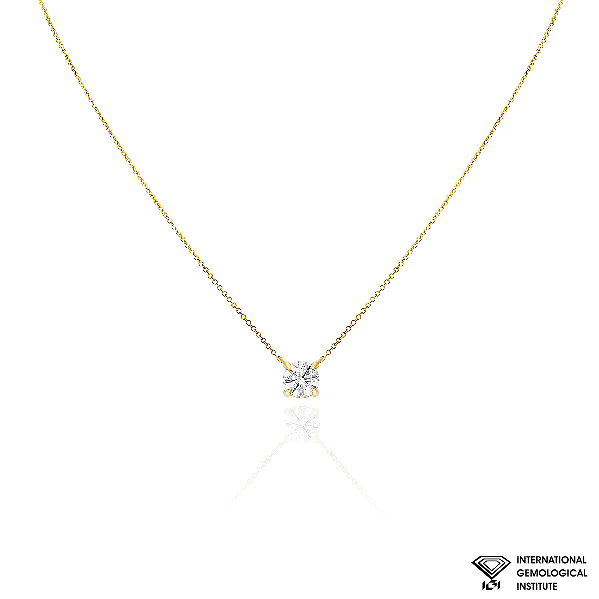 A marvellous 18k white gold lab grown diamond pendant. The pendant is adorned with a round brilliant cut lab grown diamond in a modern four prong setting weighing 1.46ct, G colour and VS1 clarity. The pendant features the rabbit ears style bail that threads an 18-inch chain, finishes with a lobster clasp fitting and has a gross weight of 3.63 grams.
