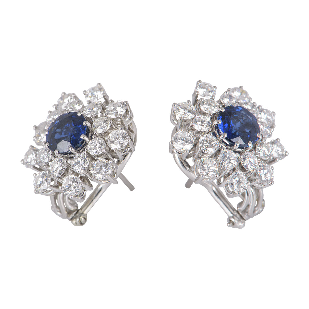 A pair of 18k white gold sapphire and diamond cluster earrings. The earrings are set to the centre with round cut sapphires totalling approximately 1.20ct in a nine claw setting with a cluster of round brilliant cut diamonds totalling approximately 1.62ct. The earrings feature post and alpha back fittings with a gross weight of 8.60 grams.