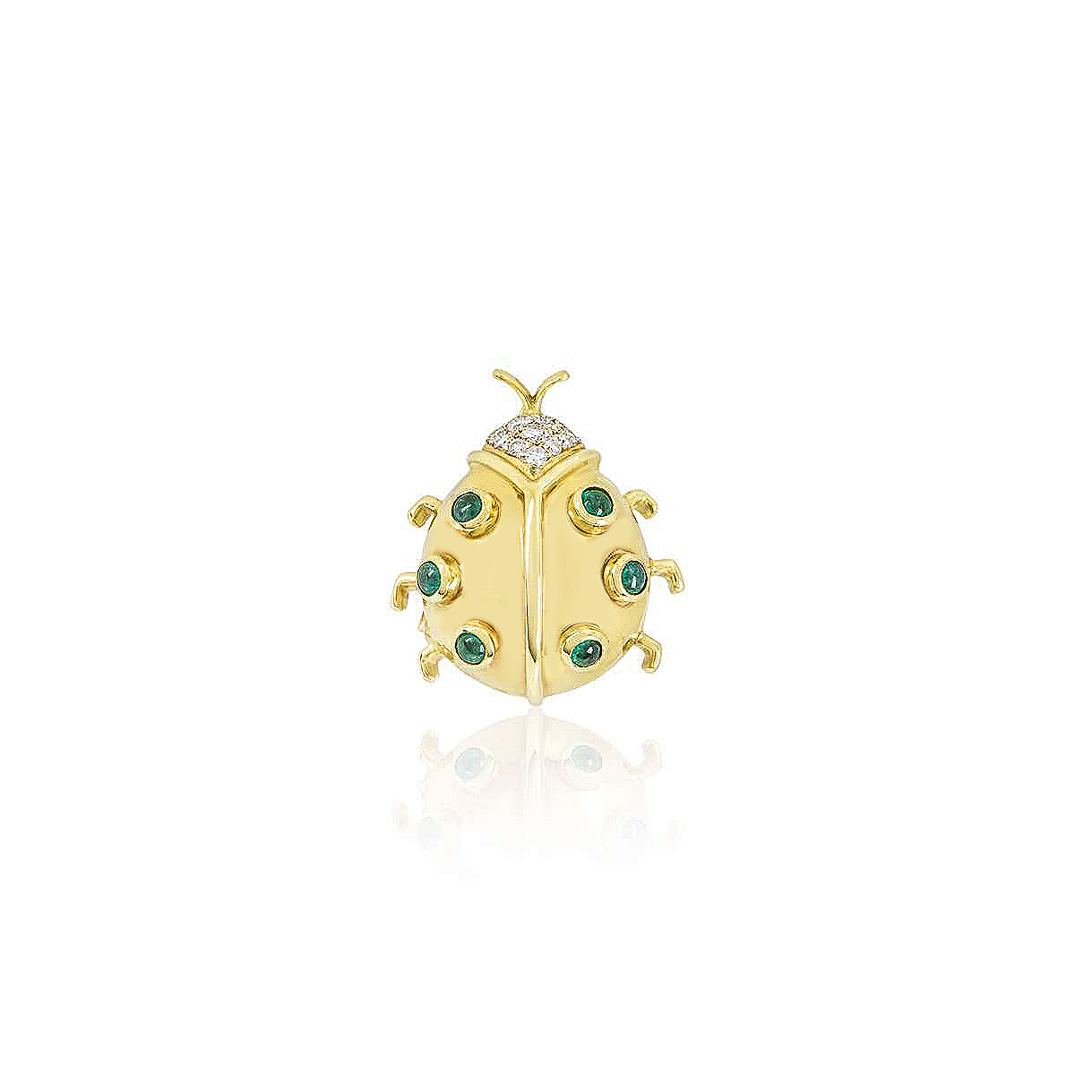 An 18k yellow gold Ladybird brooch. The brooch is set with 4 cabochon emeralds throughout the wings, with a row of 9 square cut sapphires running through the centre of the body and 28 round brilliant cut diamonds set in the wings and head. The rubies total approximately 0.40ct, the sapphires total approximately 0.24ct and the diamonds total approximately 0.56ct. The butterfly measures 2cm in width and 2.5cm in length, complete with a pin clasp at the back. The brooch has a gross weight of 6.8 grams.