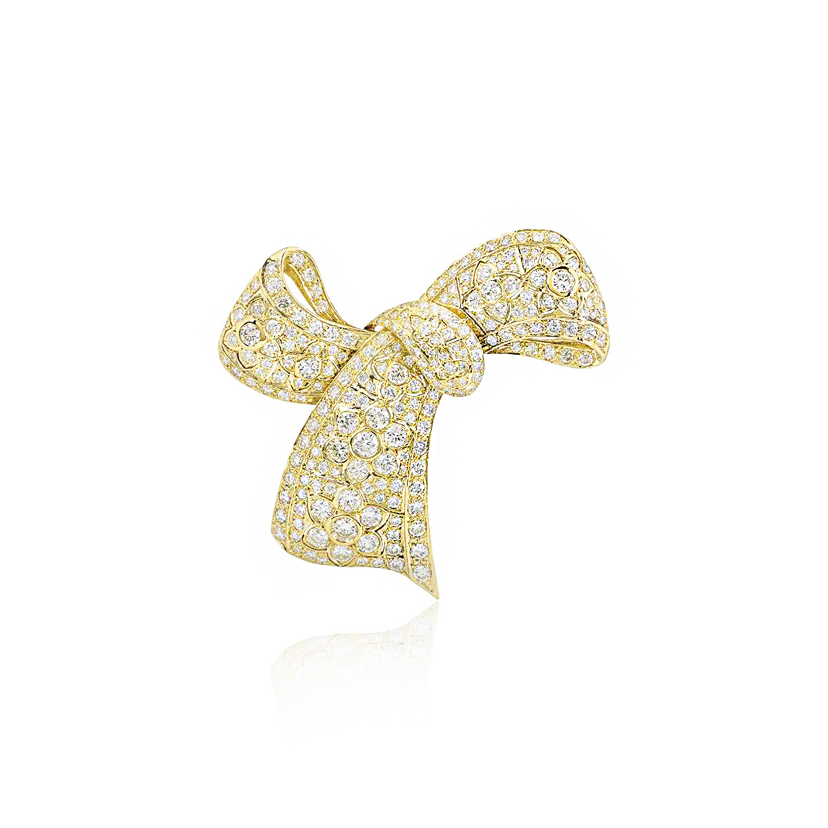 An 18k yellow gold diamond Bow brooch. The brooch is set with round brilliant cut diamonds, totalling approximately 2.71ct. The brooch measures 4.5cm in width and 5cm in length and has a pin closure to the reverse. The brooch has a gross weight of 23.6 grams.