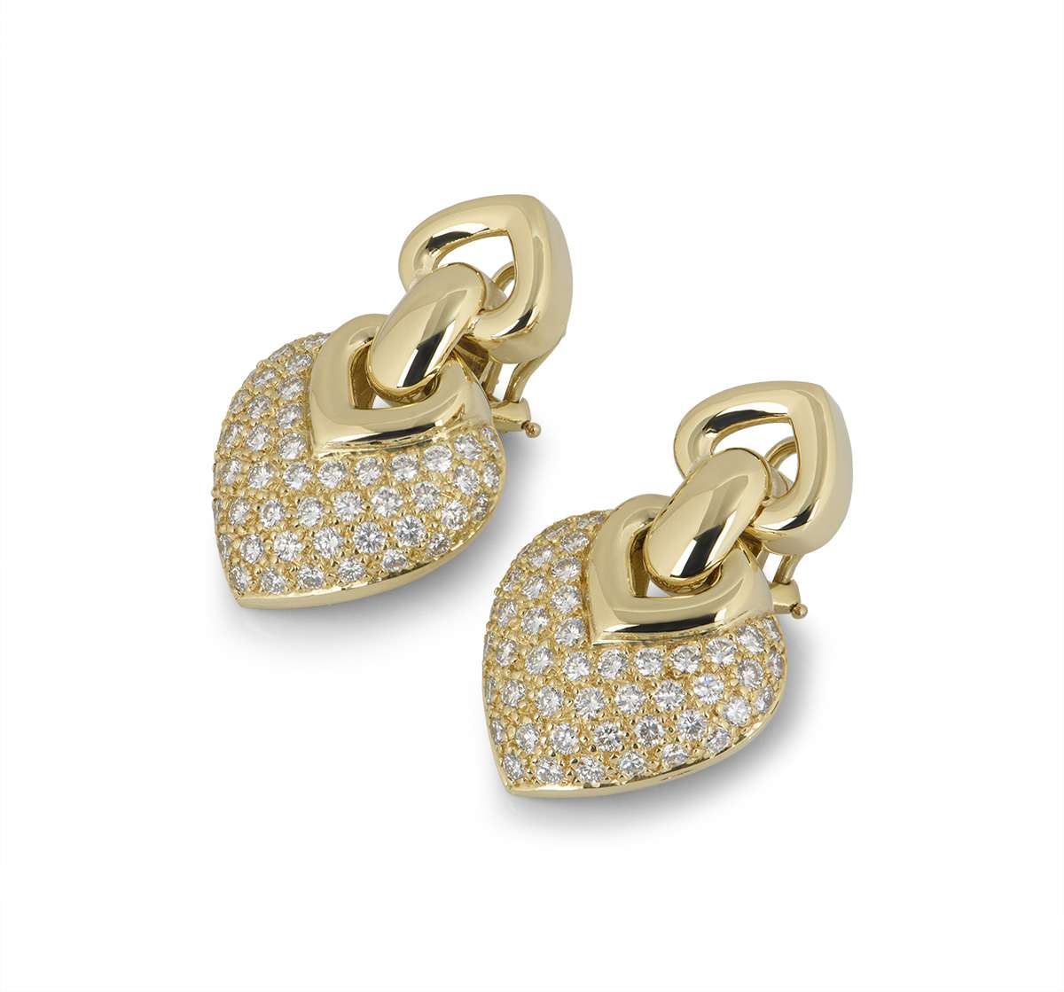 A beautiful pair of 18k yellow gold diamond earrings. The earrings feature a heart shaped motif pave set with round brilliant cut diamonds, totalling approximately 2.40ct. The earrings measure 3.4cm in length and feature post and hinge clip fittings. The earrings have a gross weight of 25.7 grams.