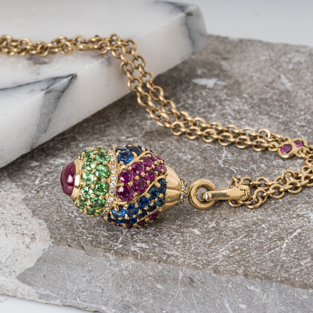 A unique 18k yellow gold diamond and multi-gem pendant. The pendant features an egg motif set to the bottom with a bezel set round cabochon ruby and pave set with 54 round brilliant cut diamonds set to the bail, top and middle of the pendant with an approximate weight of 0.46ct. Further detailing the pendant are 6 round cut rubies bezel set to the chain, 30 round cut rubies alternating in a swirl design with 40 round cut sapphires and 26 round cut peridots. The rubies have an approximate weight of 2.65ct, the sapphires have an approximate weight of 1.98ct, and the peridot has an approximate weight of 2.04ct. The pendant, including the bail, measures 26mm in length and 17mm in width. It finishes with a lobster clasp and has a gross weight of 28.2 grams