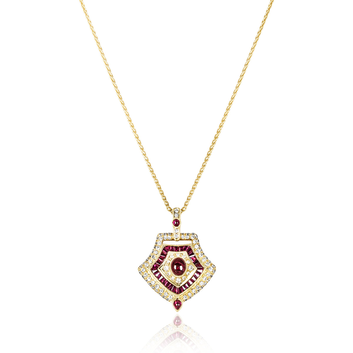 An 18k yellow gold ruby and diamond pendant. The pendant features a large sailing boat motif, set with round brilliant cut diamonds and rubies. The diamonds have a total weight of approximately 1.63ct and the rubies total approximately 4.69ct. The boat motif measures 4cm in width and 6cm in length. The pendant comes on a 24 inch chain with lobster clasp and has a gross weight of 37.3 grams.