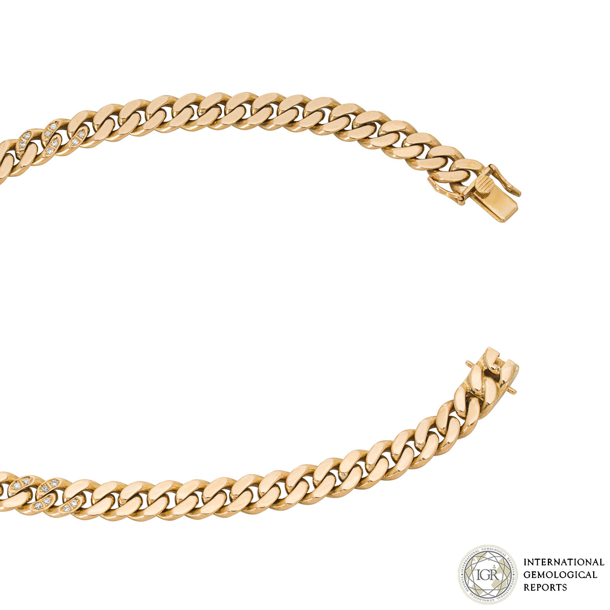 A unique 18k yellow gold ruby and diamond necklace. The necklace is set to the centre in a six prong mount with a 2.40ct oval mixed cut ruby that displays a bright medium pinkish-red hue. Set to either side of the ruby in a white gold four prong mount, are single round brilliant cut diamonds with an approximate weight of 0.91ct, H-I colour and SI clarity. Further complementing the centre design are 96 round brilliant cut diamonds set throughout the curb link chain, with an approximate total weight of 0.91ct, F-H colour and SI-I clarity. The necklace measures 16 inches in length, has a tongue clasp with 2 additional figure 8 safety clasps to either side for added security and has a gross weight of 67.24 grams.