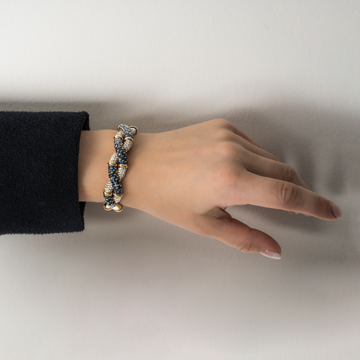 An 18k yellow gold sapphire and diamond cuff bangle. The intertwining bangle features 143 baguette cut sapphires weighing approximately 5.44ct, displaying a deep blue hue. Alternating with the sapphires are 150 round brilliant cut diamonds with an approximate total weight of 3.04ct, G-I colour and SI clarity. The flex style cuff measures 1.5cm in width, would fit a wrist size of up to 5.5 inches and has a gross weight of 57.46 grams.